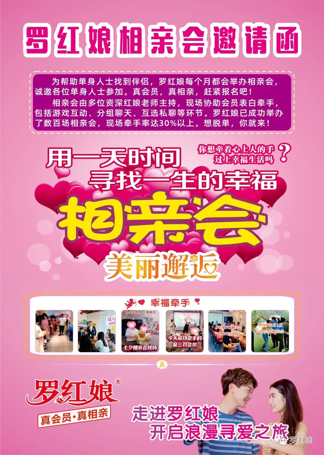 1、欢迎政府单位、事业单位、企业、机构、协会、大型商场、景区等,联系罗红娘合作举办免费的公益相亲会,帮助更多单身青年脱单,利国利民,造福社会。